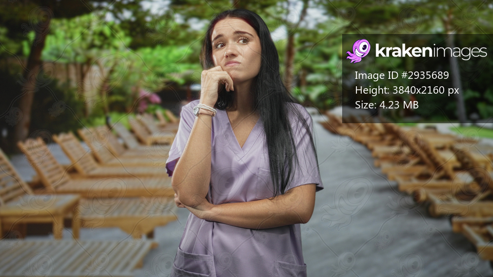 Young hispanic woman nurse in lavender scrubs with hand on chin thinking poolside by empty lounge chairs; concern contemplation.