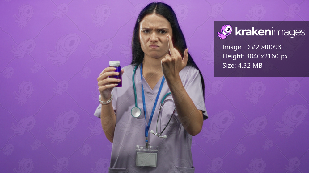 Young hispanic woman nurse wearing scrubs and stethoscope holding pill bottle and showing middle finger gesture in studio; anger defiance.