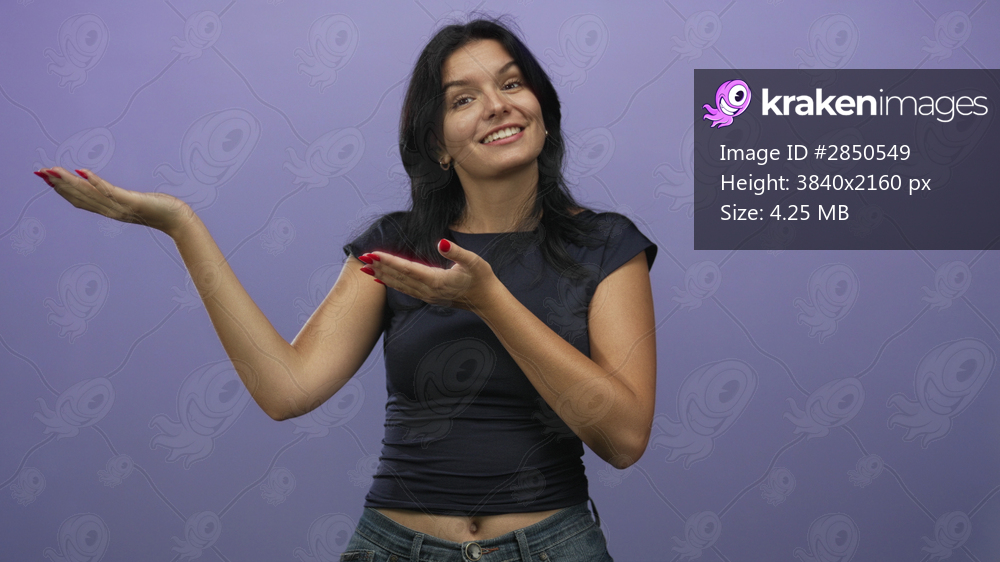 Young hispanic woman offering open hands gesture in violet studio; curiosity discovery inspiration wonder.
