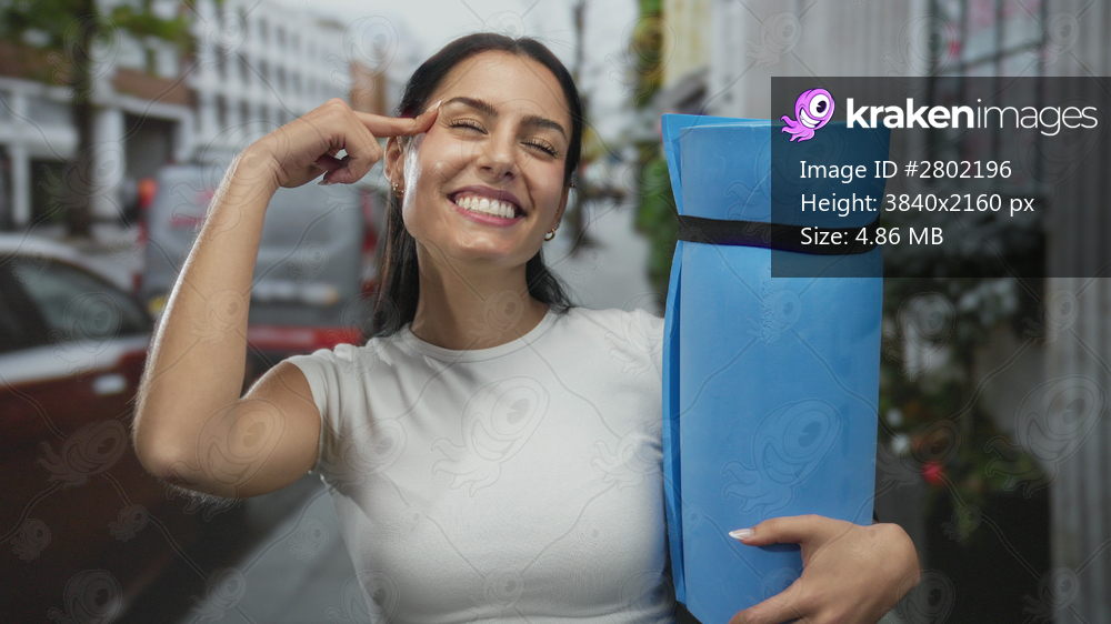 Young hispanic woman on city street points to her head playfully while holding a yoga mat, surrounded by urban activity indicating outdoor exercise and healthy lifestyle. - Kraken Images