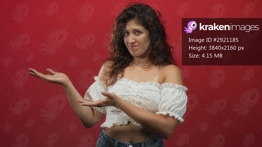 Young hispanic woman with open hands gesturing in red studio wearing white smocked top and denim jeans; confusion questioning.