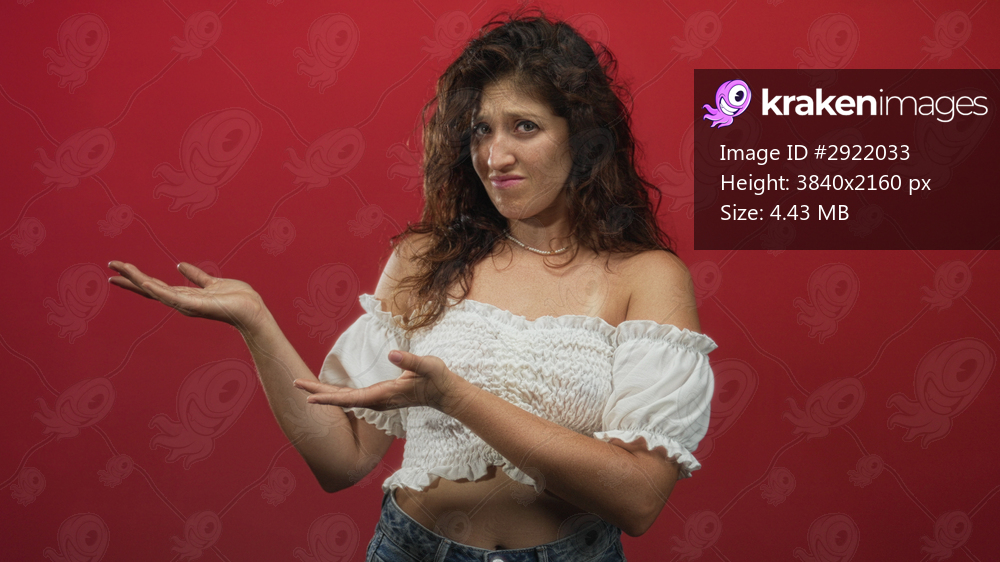 Young hispanic woman with open hands gesturing in red studio wearing white smocked top and denim jeans; confusion questioning.
