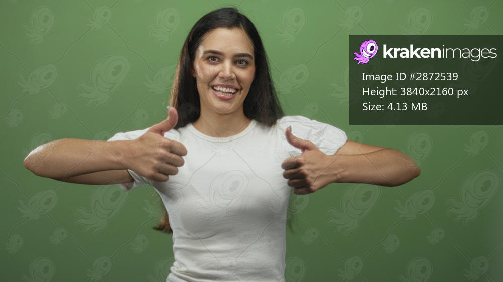 Young hispanic woman with open mouth smiling and giving thumbs up with both hands in green studio; optimism.
