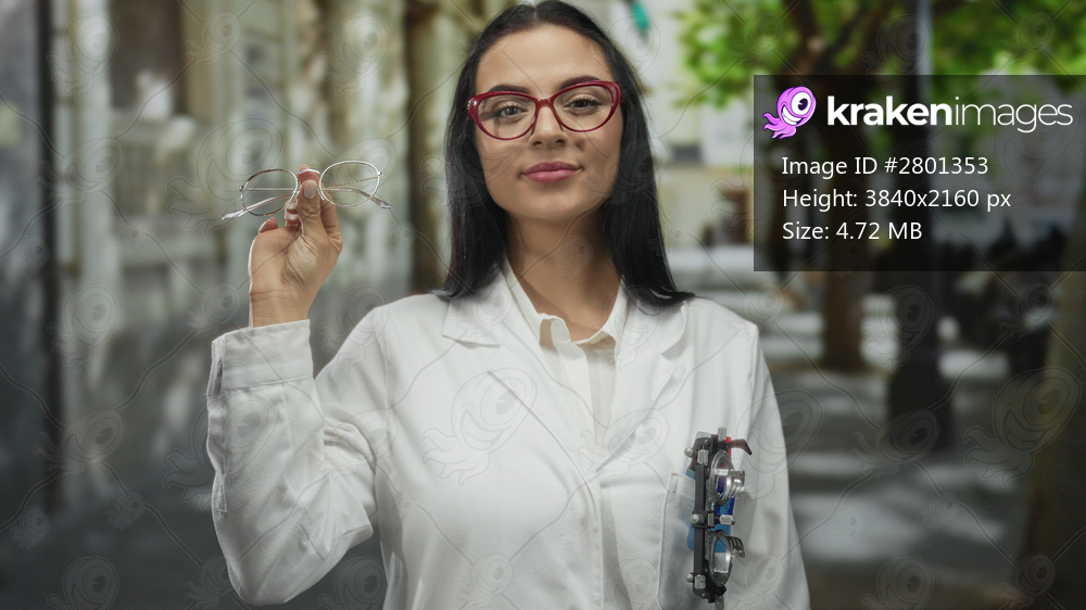 Young hispanic woman optician in white uniform examining glasses outdoors on a sunny street with trees and blurred urban background