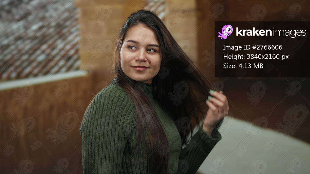 Young hispanic woman outdoors at old university with hand in hair and green sweater, smiling confidently against a historic architecture backdrop.