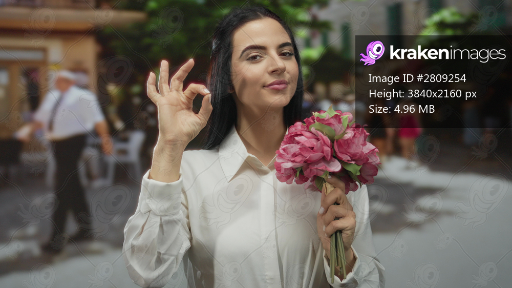 Young hispanic woman outside on a street holding a vibrant flower bouquet and making an okay gesture, embodying positivity and elegance in an urban setting. - Kraken Images