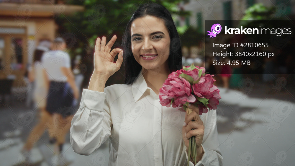 Young hispanic woman outside on a street holding a vibrant flower bouquet and making an okay gesture, embodying positivity and elegance in an urban setting. - Kraken Images