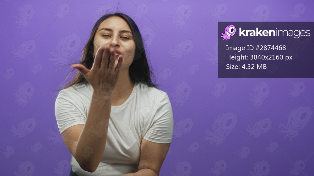 Young hispanic woman with outstretched hand blowing a kiss in a purple studio, smiling with closed eyes and casual white tee; warmth affection joy.