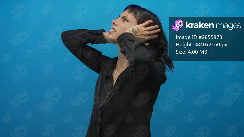 Young hispanic woman with pained expression grasping both ears in a vibrant blue studio setting; distress.