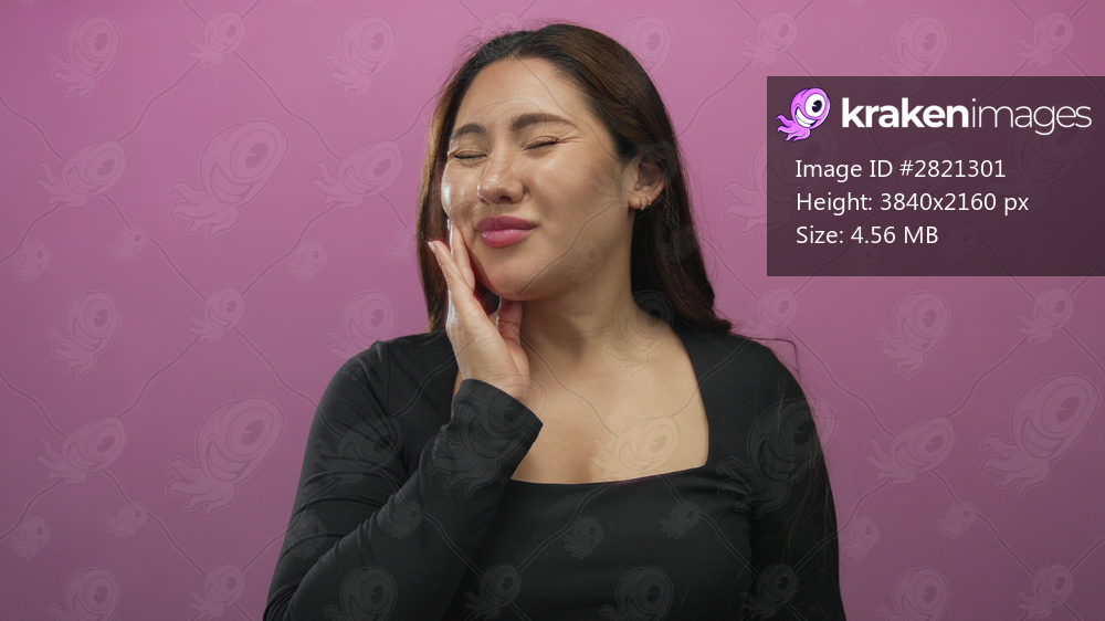 Young hispanic woman with pained expression pressing cheek for toothache in pink studio; dental discomfort.