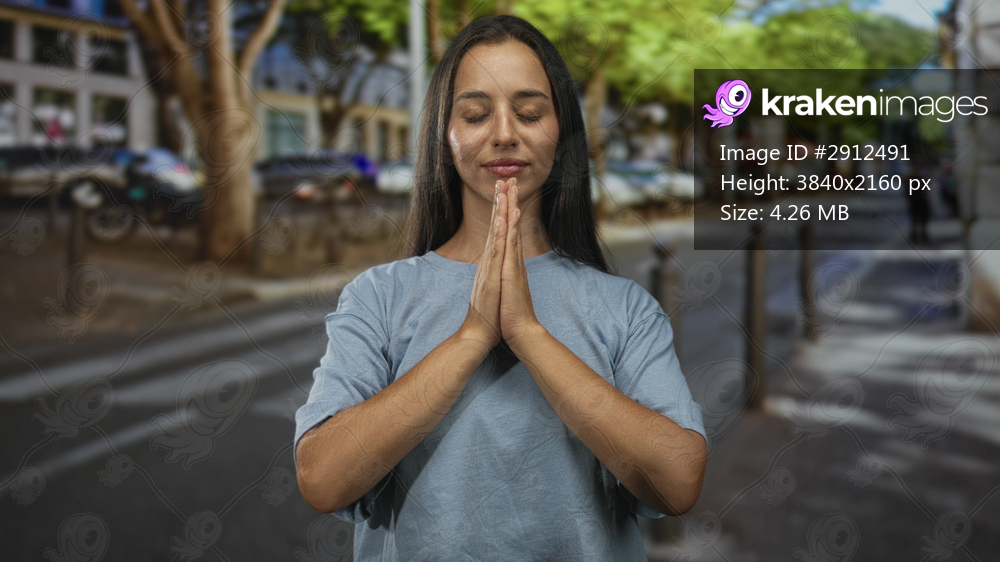 Young hispanic woman with palms together in prayer on a city street, eyes closed, wearing a blue tshirt; serenity.