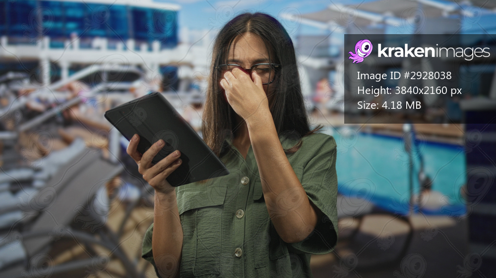Young hispanic woman pinched nose while holding tablet by pool on building deck; disgust travel worry.
