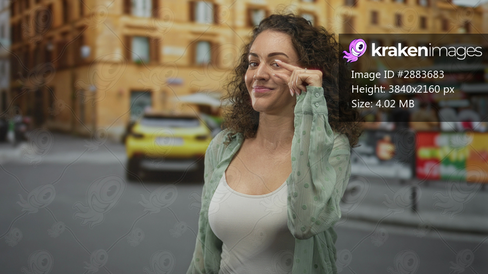 Young hispanic woman pinches fingers to eye while smiling on a busy city street near a yellow car and food cart; playful joy.
