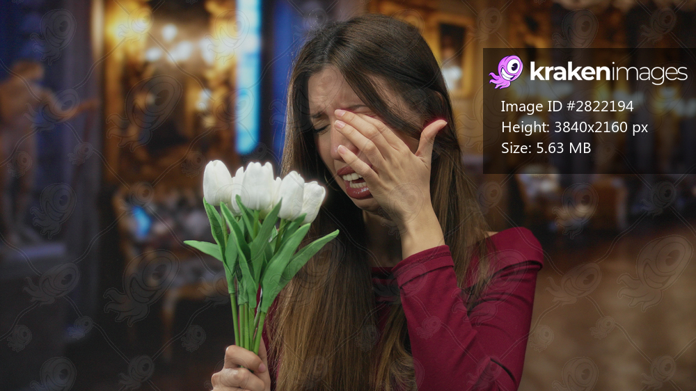 Young hispanic woman pinches nose at bouquet of white tulips in ornate museum hall; revulsion unease.