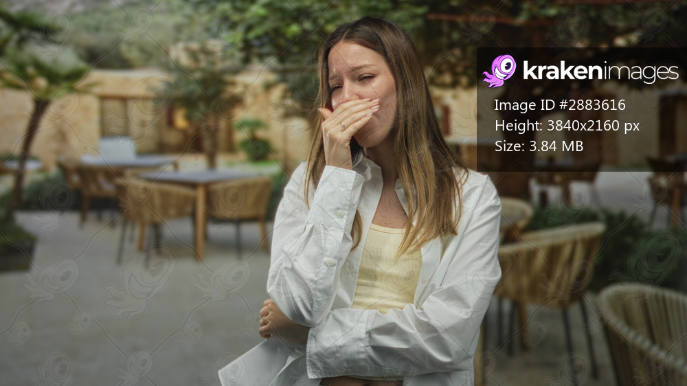 Young hispanic woman pinches nose and covers mouth with hand at outdoor restaurant terrace with wicker chairs and trees; disgust nausea avoidance.