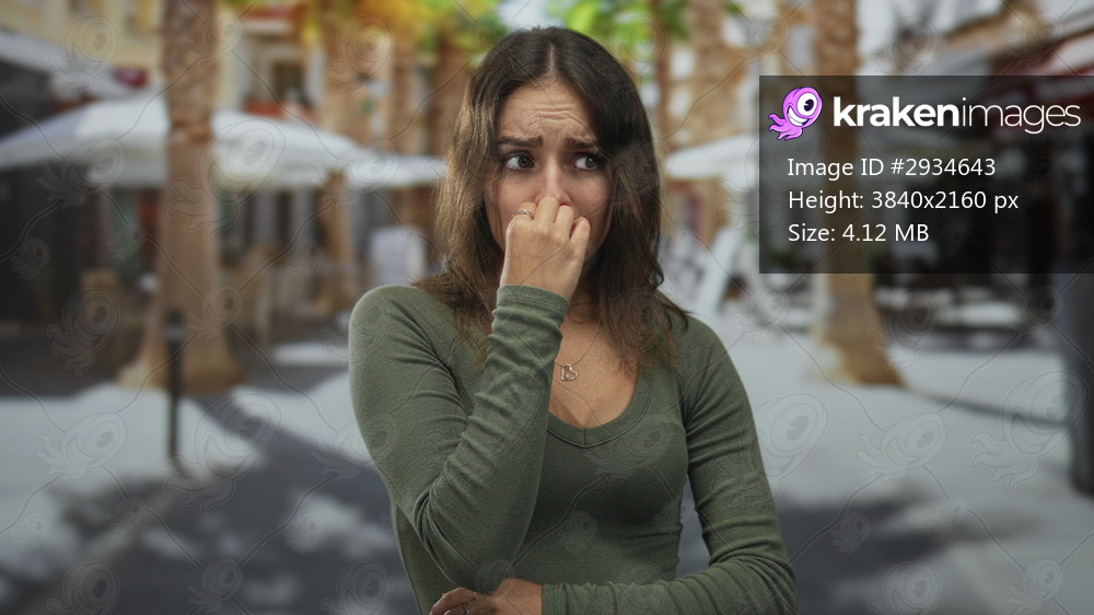 Young hispanic woman pinching nose with hand near outdoor cafe umbrellas on city street wearing heart necklace and rings; disgust discomfort.