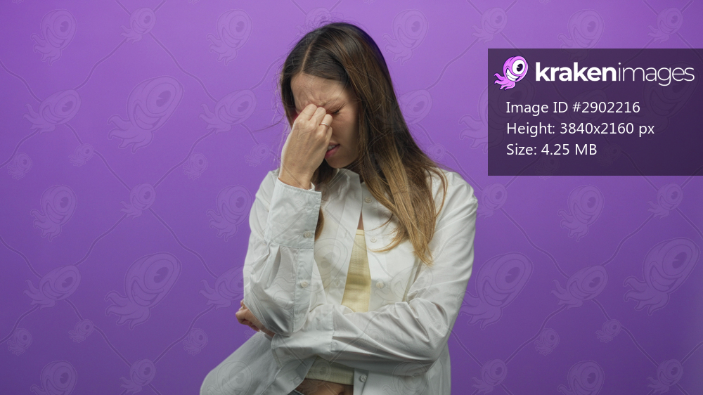 Young hispanic woman pinching nose and rubbing bridge with hand in studio purple backdrop wearing white shirt and cropped undershirt; stress.