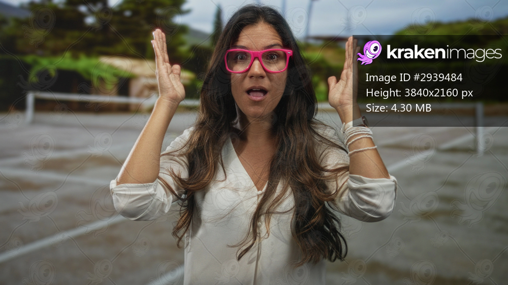 Young hispanic woman with pink glasses and long hair raising both hands beside face on outdoor tennis court, open mouth expression; surprise curiosity reaction. - Kraken Images