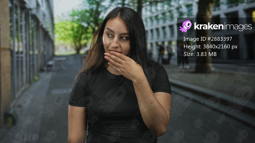 Young hispanic woman places hand on chest on city street wearing black tshirt near urban buildings and tree lined pavement; confidence.