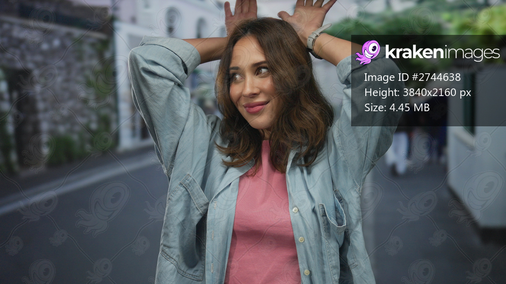 Young hispanic woman playfully posing on a city street outdoors wearing casual denim and pink shirt with a charming smile and vibrant energy.