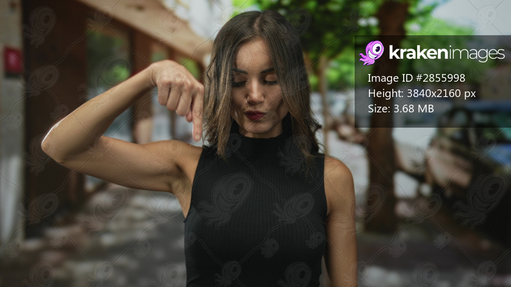 Young hispanic woman pointing both index fingers down to pavement on a sunlit busy urban street scene; attention curiosity engagement focus.