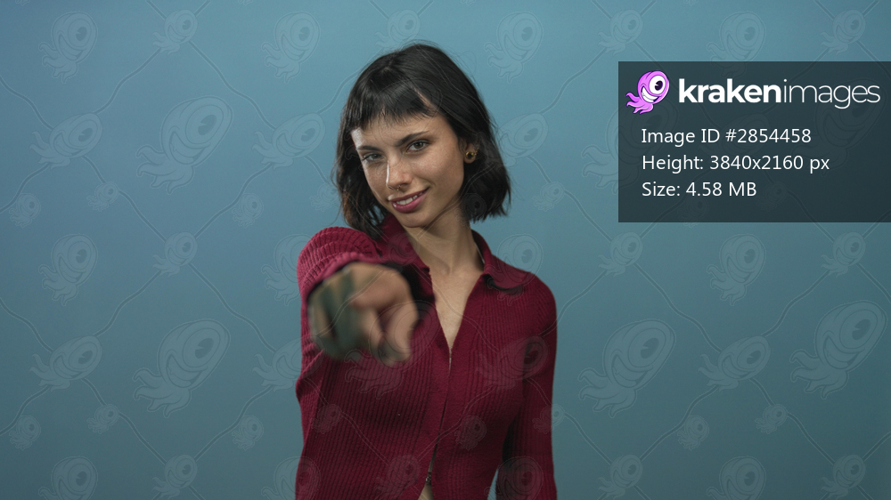Young hispanic woman pointing finger against blue studio wall with bright smile and direct eye contact; confidence.