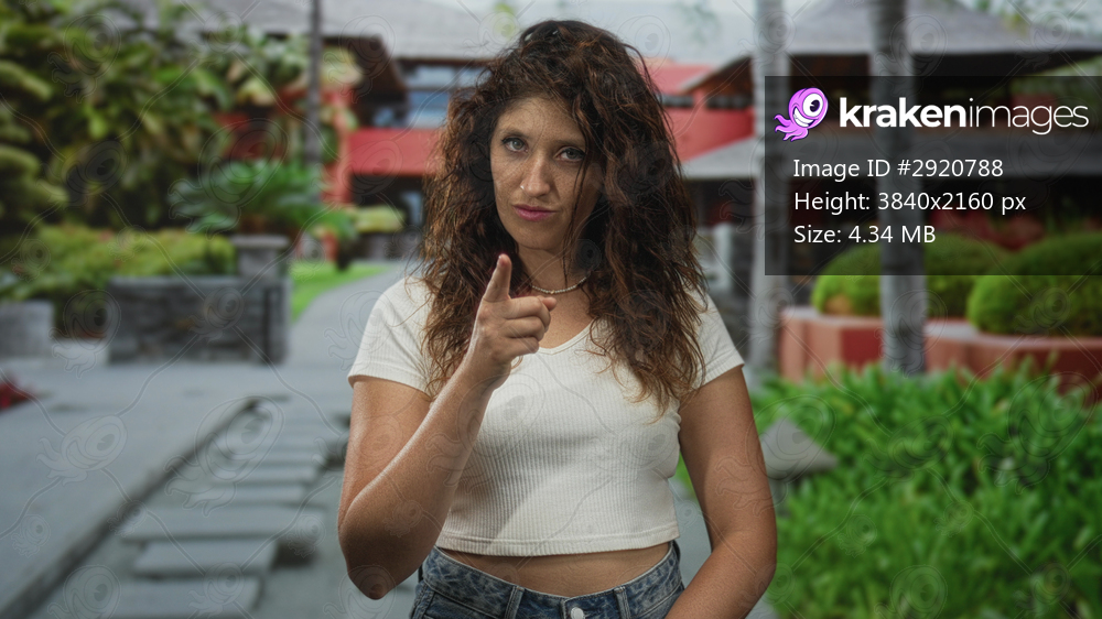 Young hispanic woman pointing finger at camera on a sunny street with red building and palm trees; stern warning.