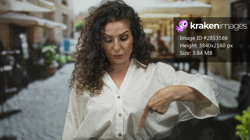 Young hispanic woman pointing finger down to cobblestone pavement on bustling city street at daytime; confidence instruction guidance emphasis.