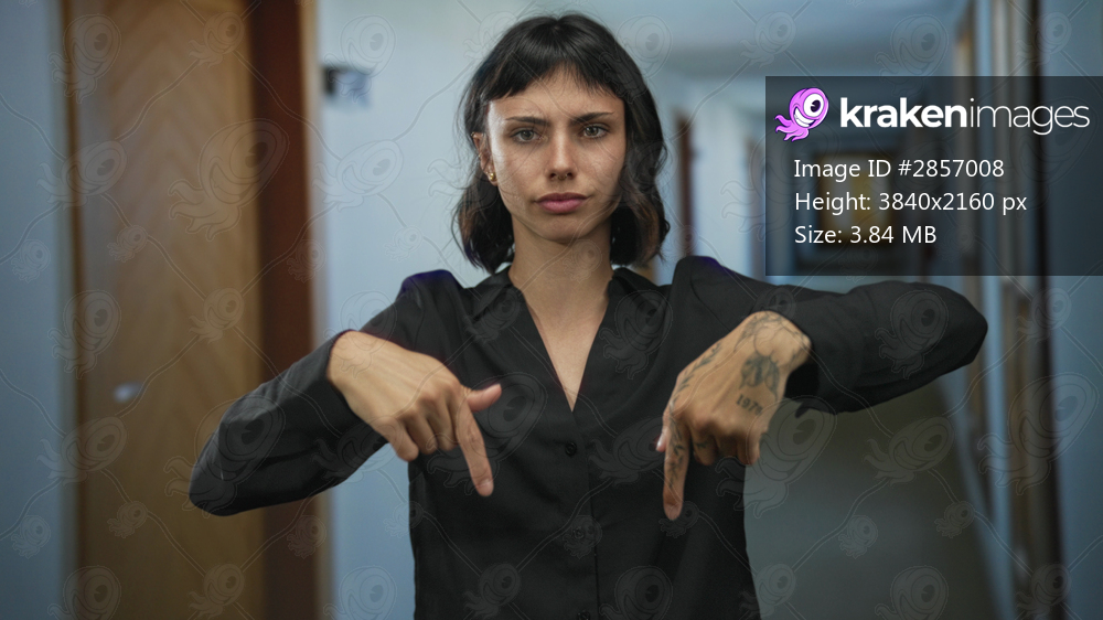 Young hispanic woman pointing finger downward in hotel building corridor with wooden doors behind her; alertness warning.