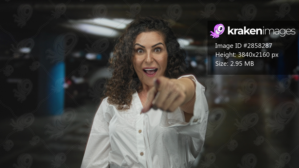 Young hispanic woman pointing finger forward in indoor parking building with cars behind her; confidence.