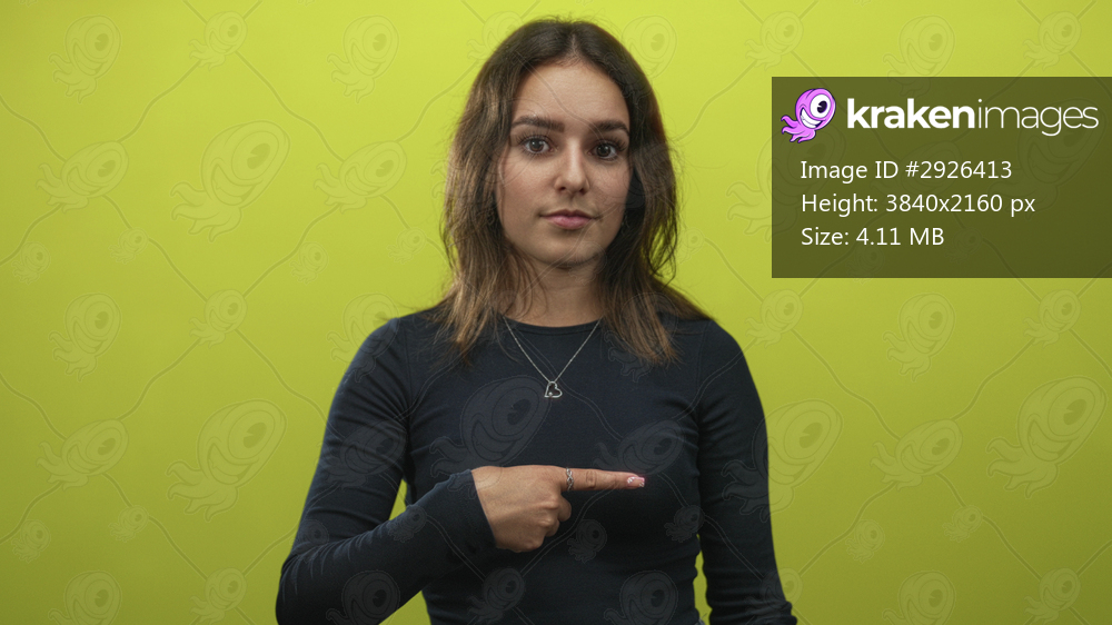 Young hispanic woman pointing finger and giving thumbs up in studio with lime green wall; approval success.