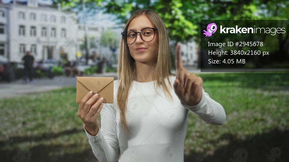 Young hispanic woman pointing finger and holding a brown envelope in a city park near building facades; curiosity secret.