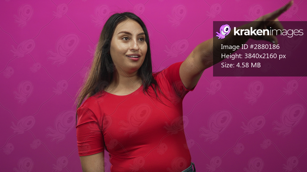 Young hispanic woman pointing finger in magenta studio with visible finger and red shirt; surprise curiosity.