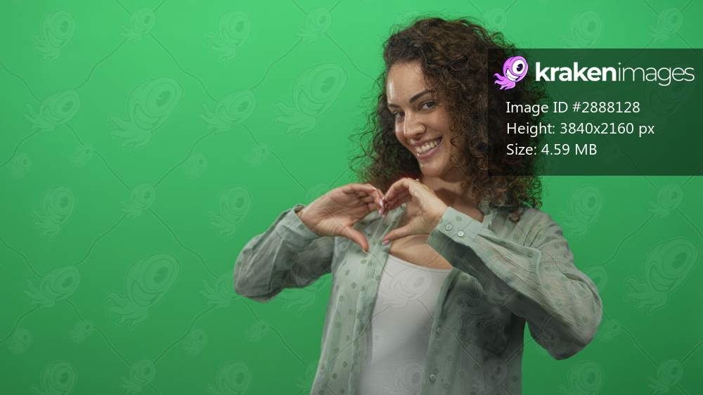 Young hispanic woman pointing finger and making heart shape with hands in green studio; joy affection.