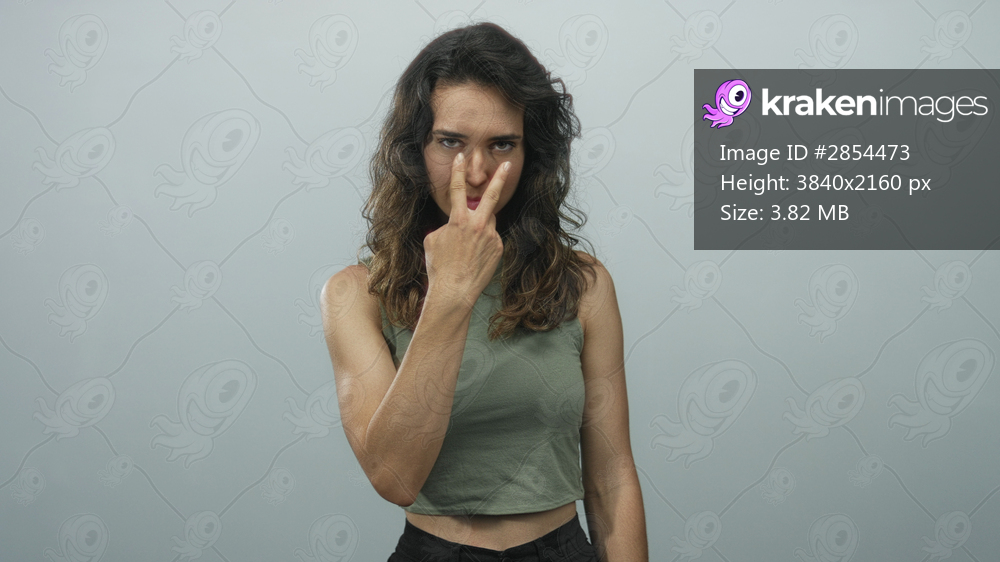 Young hispanic woman pointing finger to camera in grey studio with serious expression; confidence focus determination.