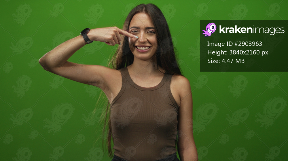 Young hispanic woman pointing finger to nose and smiling in green studio; playful confidence, cheeky charm.