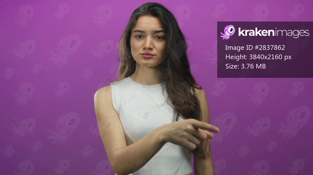 Young hispanic woman pointing finger toward right in purple studio setting, eyes fixed on off frame direction; focus.