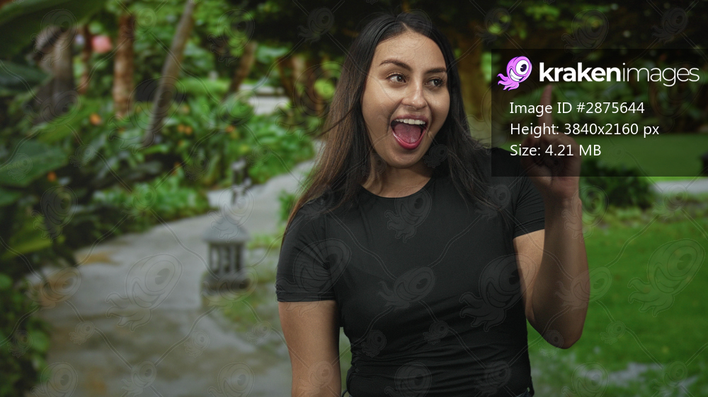 Young hispanic woman pointing finger upward on a park path lined with green trees and grass; playful suggestion.