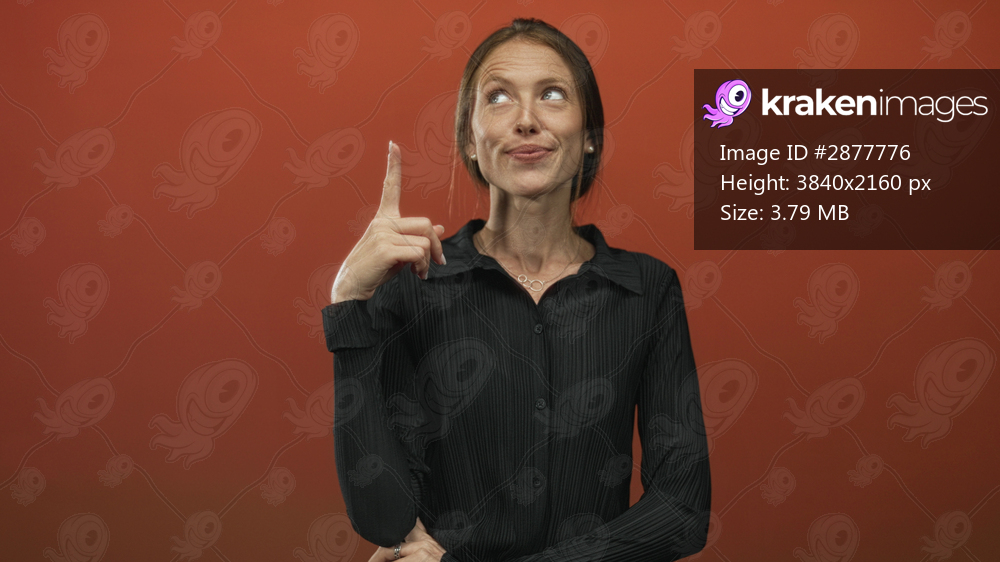 Young hispanic woman pointing finger upward with smiling expression in studio against orange wall; playful curiosity.
