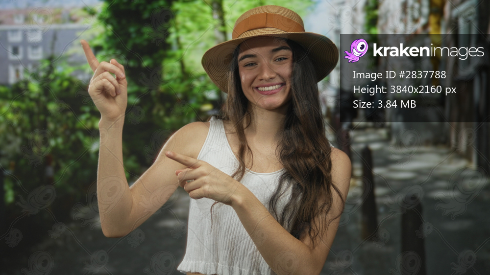 Young hispanic woman pointing finger upwards at something on a sunlit city street while smiling softly; happiness.