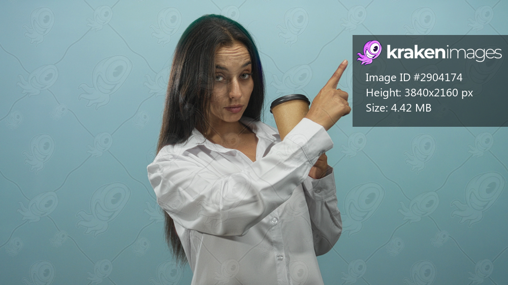 Young hispanic woman pointing finger while holding a takeaway coffee cup and wearing a white shirt in blue studio; impatience instruction.