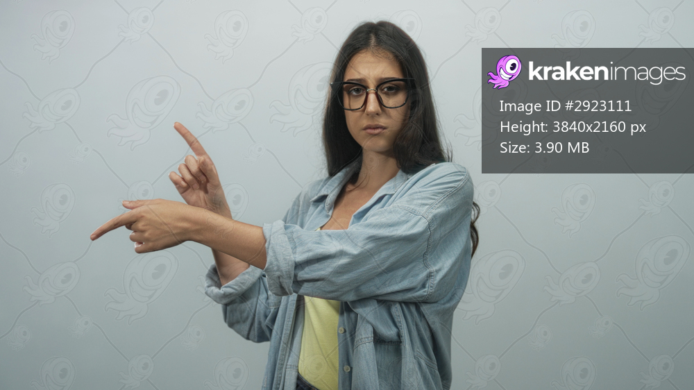 Young hispanic woman pointing fingers with both hands and wearing glasses and denim shirt against a pale blue studio wall; doubt.