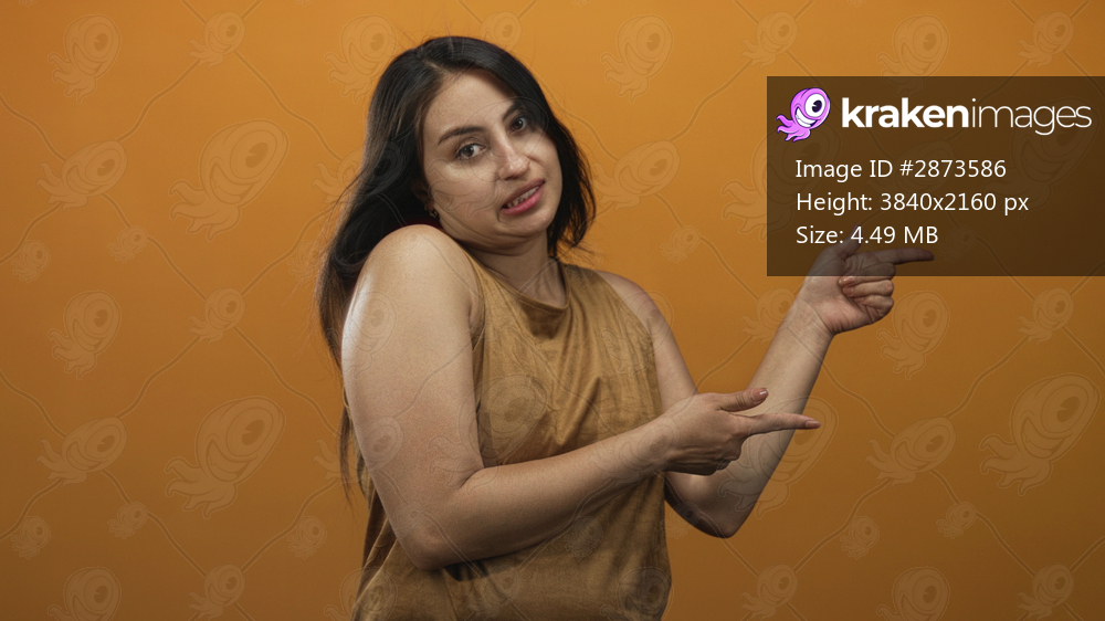 Young hispanic woman pointing fingers to the right in orange studio, waist up pose with windswept hair; playful cheeky humor.