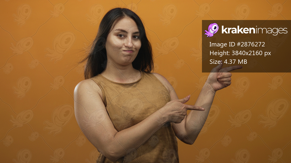 Young hispanic woman pointing fingers to the right in orange studio, waist up pose with windswept hair; playful cheeky humor.