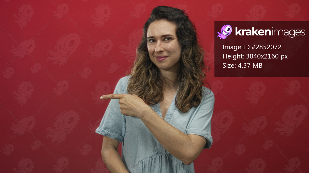 Young hispanic woman pointing her finger to the right in a studio setting with a red backdrop; curiosity.