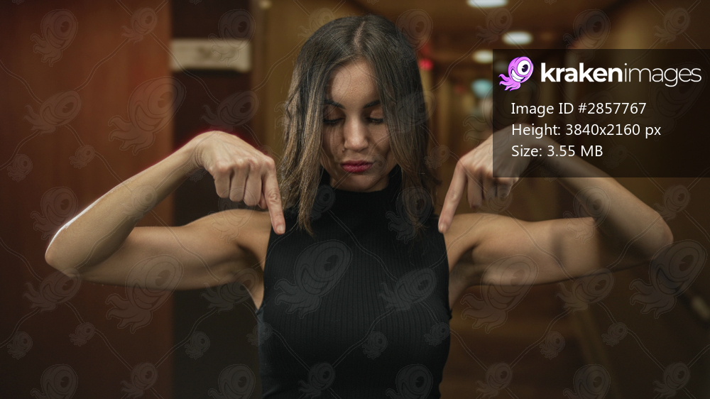 Young hispanic woman pointing her index fingers down at the corridor floor in a hotel building; anticipation.