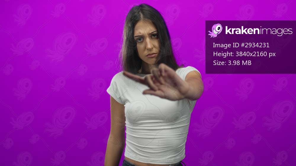 Young hispanic woman pointing index finger toward camera in purple studio setting with white crop top and visible midriff; disapproval confrontation assertiveness. - Kraken Images