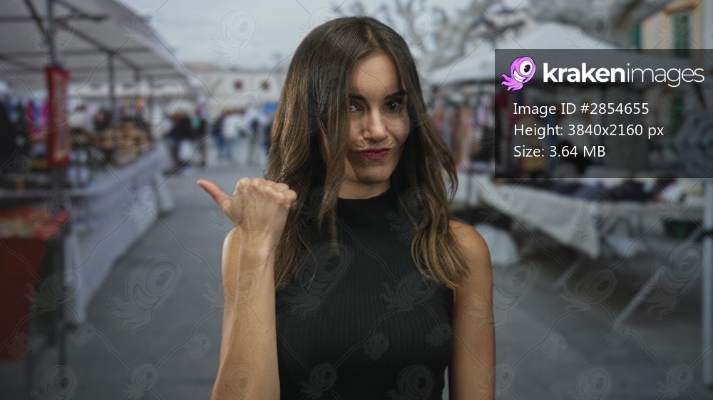 Young hispanic woman pointing thumb to colorful souvenir stalls at crowded outdoor street market; adventure and curiosity.