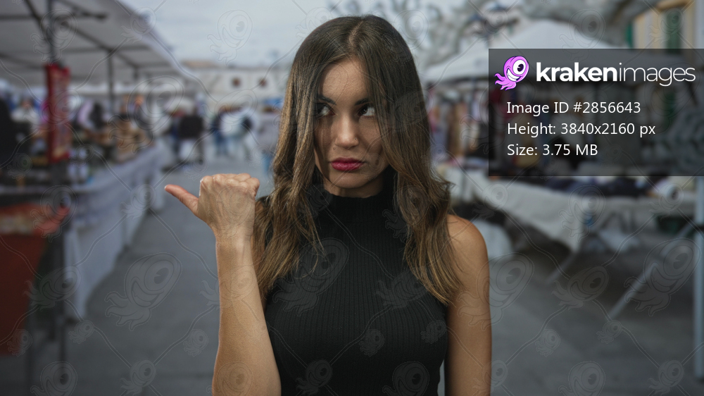 Young hispanic woman pointing thumb to colorful souvenir stalls at crowded outdoor street market; adventure and curiosity.