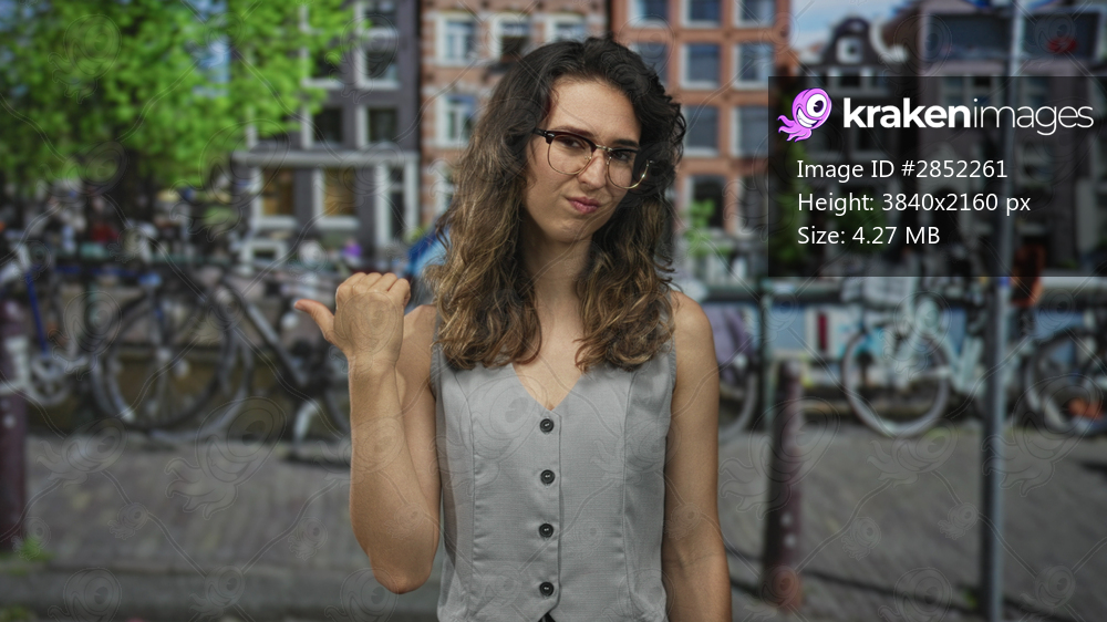 Young hispanic woman pointing thumb to street amid parked bicycles on urban canal bridge; skepticism.